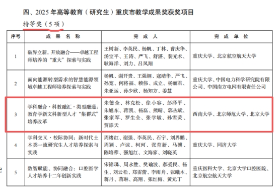 近日,重庆市人民政府发布了《关于2025年重庆市教学成果奖励的决定》(渝府发〔2025〕17 号)。学部部长朱德全教授领衔申报的《学科融合·科教融汇·类型融通:教育学新文科新型人才“集群式”培养改革》荣获高等教育(研究生)重庆市教学成果奖特等奖。
