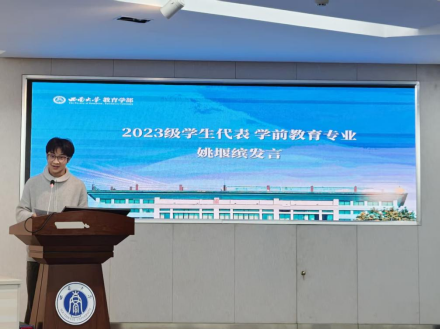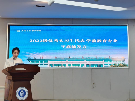 2022级优秀实习生代表王鑫榆发言,分享了自己从“配合者”到“组织者”,从“理论者”到“实践者”的实习成长经历,寄语师弟师妹们在看见中理解教育,在参与中积累经验,在成长中靠近理想。2023级学生姚堰缤作为实习生代表发言,他号召同学们在实习过程中严守纪律、主动思考、积极总结,以认真踏实的态度、积极投入的行动和持续反思的习惯完成实习任务,收获美好成长。