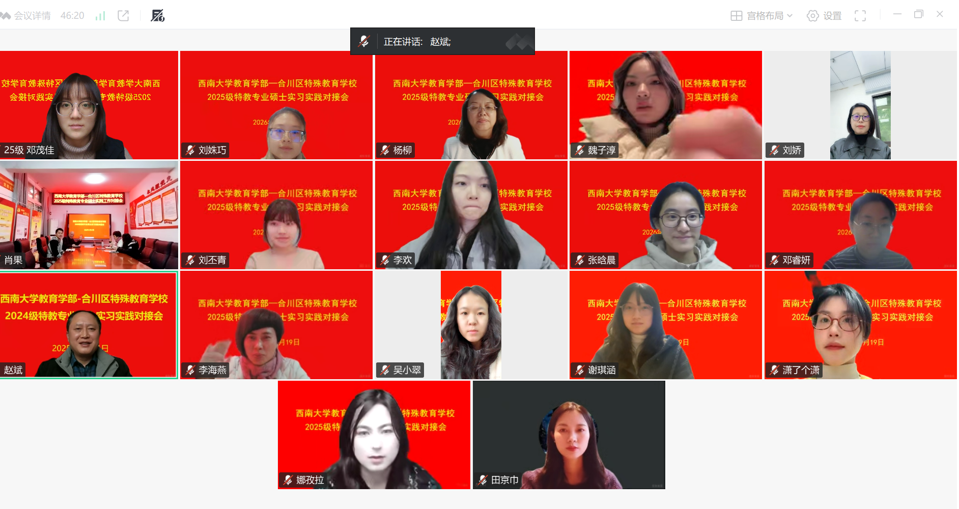 2026年1月19日,西南大学必赢3003no1线路检测中心为顺利推进春季2025级特殊教育专业硕士实习实践工作,特召开实习实践工作线上对接会议。会议旨在让2025级同学明确春季实习安排,提早规划,确保实习工作顺利开展。会议由必赢3003no1线路检测中心特殊教育学院赵斌院长主持,参会人员包括必赢3003no1线路检测中心党委副书记刘娇、教学办主任田京巾、班主任和全体导师,合川区特殊教育学校书记、校长文晓利,副校长肖果和指导教师代表吴欢,2025级特殊教育专业硕士研究生。