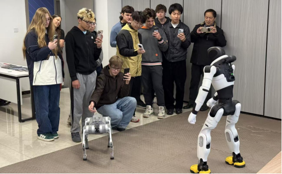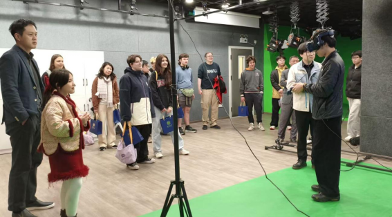随后,美国师生先后参访了学部的VR演播室、STEAM跨学科国际教育研究中心及“宇树科技”机器人演示,沉浸式体验前沿教育技术与创新实践场景。逼真的虚拟画面和充满想象力的创作空间,与机器人和机器狗的趣味互动,让美国同学们频频驻足,赞叹不已,深刻感受到了数字化、智能化背景下的教育创新魅力及中国科学技术的迅猛发展。