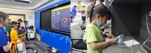 在趣味小车碰碰碰活动中,小朋友组队进行游戏,通过操作游戏手柄,控制小车发生碰撞。小朋友们在紧张刺激的游戏过程中,收获了喜悦和快乐。SCRATCH编程之音乐初体验吸引了许多小朋友前来尝试,它以一种新颖的形式让孩子的内心世界直观地呈现在眼前,小朋友们在志愿者的指引下戴上手环,通过手触碰金属弹片弹奏出美妙的音乐。