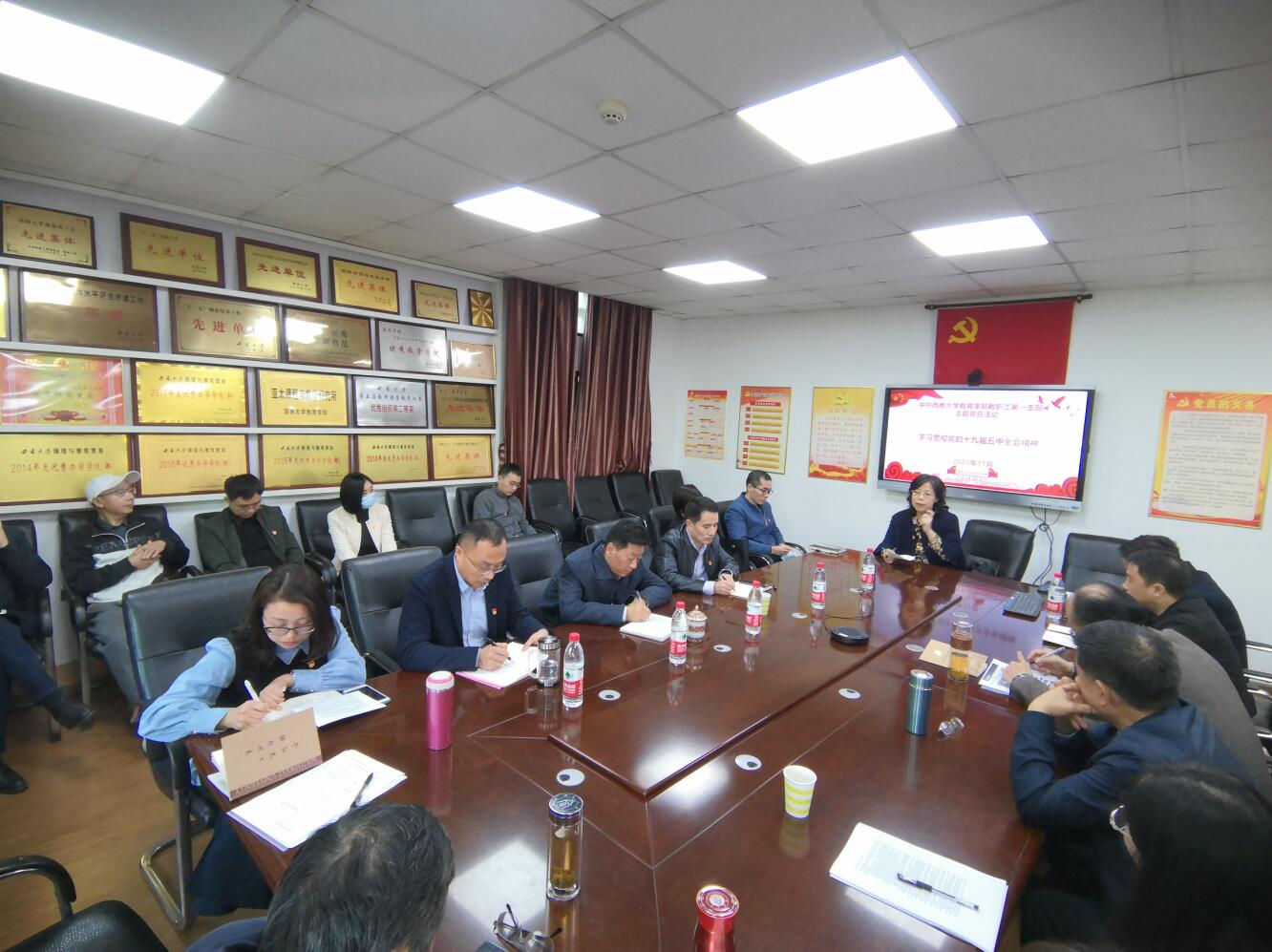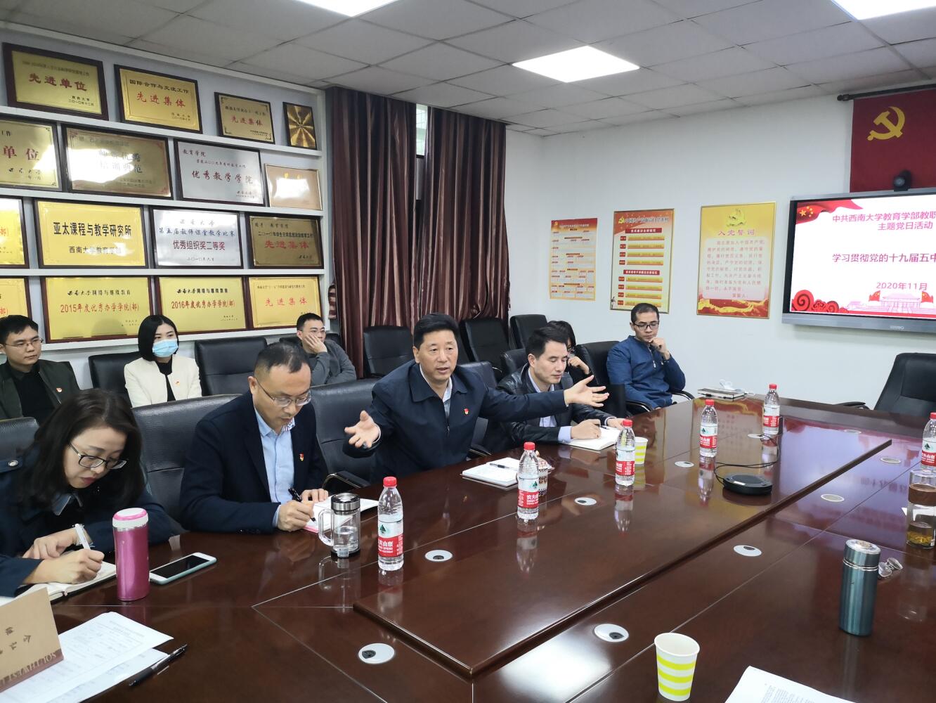2020年11月13日下午,西南大学副校长靳玉乐同志来到必赢3003no1线路检测中心315会议室参加必赢3003no1线路检测中心教工第一党支部主题党日活动。本次主题党日的活动主题是“学习贯彻党的十九届五中全会精神”。必赢3003no1线路检测中心党委书记王牧华同志、党委副书记、纪委书记卓玉兵同志、党委副书记刘娇同志列席了本次主题党日活动。活动由必赢3003no1线路检测中心教工第一党支部书记冉春同志主持。