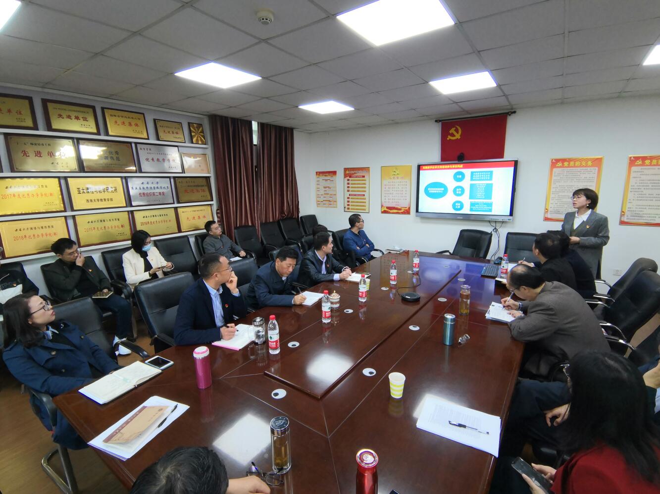 根据学校党委领导干部联系基层党支部的制度,靳玉乐同志本学期联系我学部教工第一党支部,并参加支部活动,他一来到支部就亲切招呼党员同志们,并主动认识新进的青年教师们。随后,支部活动正式展开。