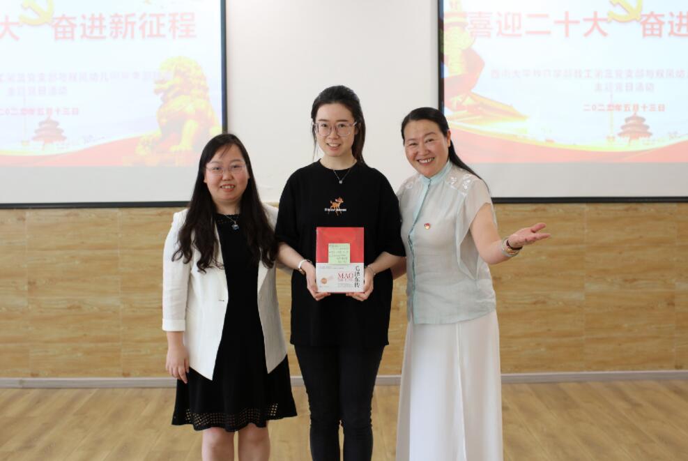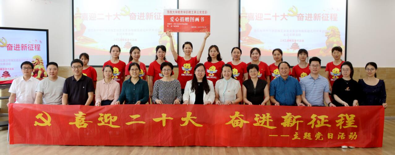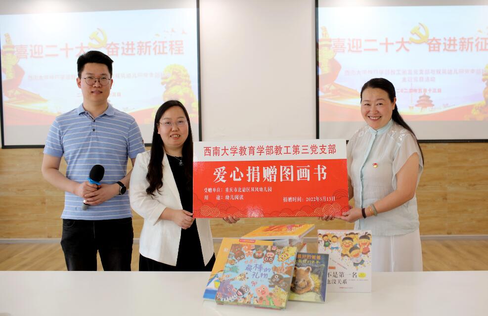 活动前,在双凤幼儿园陈洪园长的带领下,党员们一同走入幼儿园各年龄段幼儿的活动室、功能室,了解孩子们生活学习的环境、特色课程内容等。大中小班的老师们分别介绍了所在班级的主题活动开展情况。幼儿园整洁有序、温馨舒适、活动材料丰富的学习环境,给党员们留下深刻印象。活动中,双凤幼儿园陈洪园长饱含深情地回顾了双凤幼儿园办园70年的发展历程和“双凤飞舞 遇见彩虹”的办园愿景,介绍了幼儿园七彩课程的建构与实施情况和党支部开展的系列学习活动。教工第三党支部江小英书记介绍了支部的基本情况和党务工作开展情况,分享了支部丰富的主题党日活动内容和组织形式。江书记高度认可了幼儿园将日常教育教学活动与党建工作有效融合的探索,表示期待今后与幼儿园共同开展面向家长和幼儿的志愿活动。随后,胡福贞同志带领全体党员学习求是网文章《习近平:走出一条建设中国特色世界一流大学新路》,引发教师党员们思考如何从基础教育开始,顶天立地,做出中国教育的精气神。按惯例,在政治理论学习结束后,两个支部为叶桑同志庆祝了“政治生日”。最后,教工第三党支部向北碚区双凤幼儿园的孩子们赠送了精美的绘本,希望这些优质的中外经典绘本能够激发幼儿早期阅读兴趣,培养幼儿良好阅读习惯,让书香浸润孩子们的美好童年。